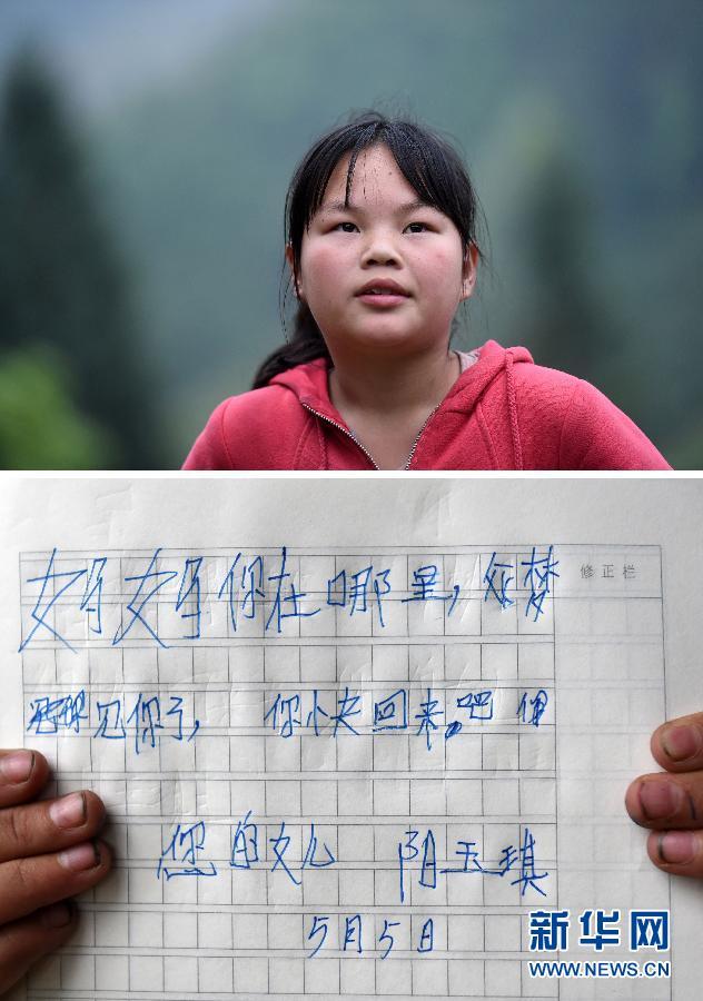Yang Yvqi, 12, is a student at Dongsheng Primary School. Her mother left her when she was eighteen months old. Her father went to look for work as a migrant worker. She now lives with her 79-year-old grandpa. She wrote to her mother: " Mother, where are you? I dreamed of you and wished you would come back soon!" |