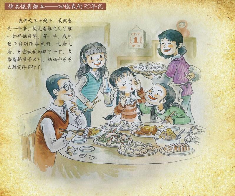 In cartoonist Jingru's work "Recall My 1970s", an illustration shows a girl finding a coin in her dumplings during the family dinner on the eve of the Lunar New Year. People always put coins when they make the dumplings, and whoever eats the dumpling with a coin is believed to have good luck in the New Year. (Photo/Xinhua) |