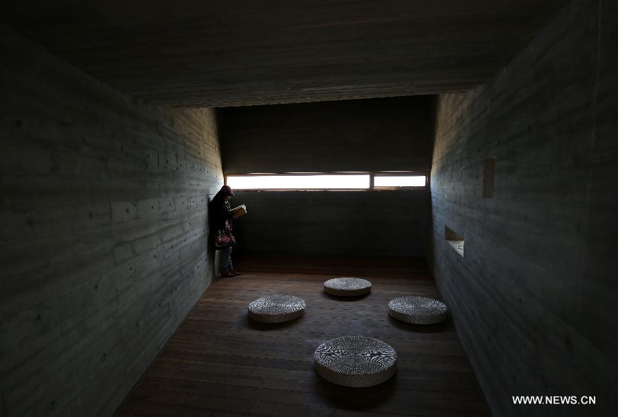 A reader is seen at the seaside public library in Qinhuangdao, north China's Hebei Province, May 14, 2015. Situated on the seafront of Qinhuangdao, the newly-built library opened its door recently. Standing alone on an empty beach, the 450-square-meter library was called "the loneliest library" by Chinese netizens and became a hot topic quickly. Designed by an architect named Dong Gong, the two-story library creates a peaceful sea view for readers. (Xinhua/Yang Shiyao) |
