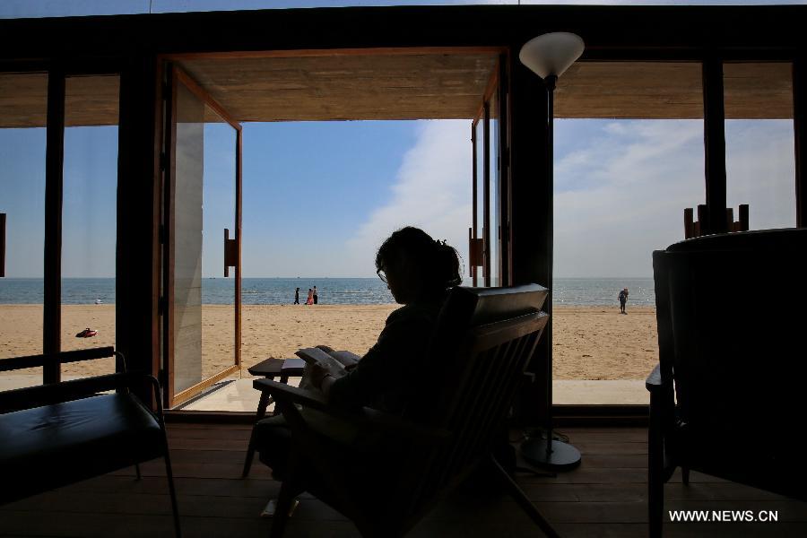 A woman reads a book at the seaside public library in Qinhuangdao, north China's Hebei Province, May 14, 2015. Situated on the seafront of Qinhuangdao, the newly-built library opened its door recently. Standing alone on an empty beach, the 450-square-meter library was called "the loneliest library" by Chinese netizens and became a hot topic quickly. Designed by an architect named Dong Gong, the two-story library creates a peaceful sea view for readers. (Xinhua/Yang Shiyao)