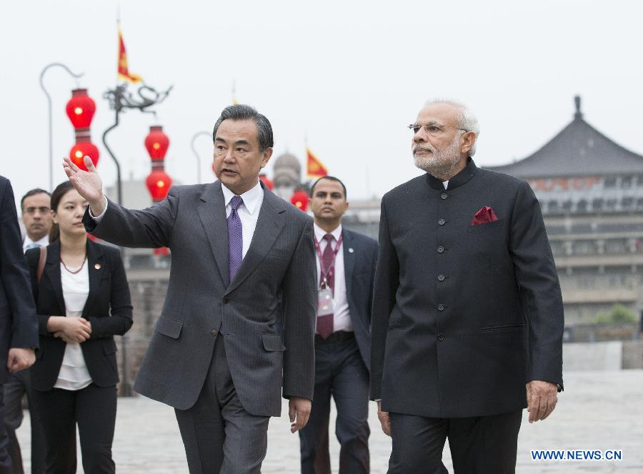 Chinese Foreign Minister Wang Yi (L front) accompanies Indian Prime Minister Narendra Modi(1st R) visiting the Xi'an city wall after a traditional Tang Dynasty (618-907) welcoming ceremony in Xi'an, capital of northwest China's Shaanxi Province, May 14, 2015. (Xinhua/Huang Jingwen) |