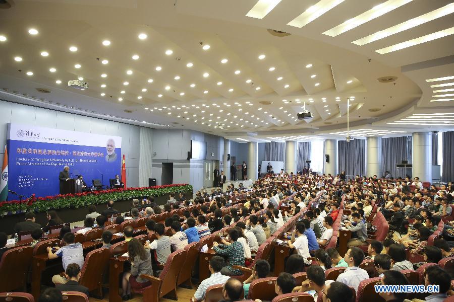 Visiting Indian Prime Minister Narendra Modi delivers a lecture at Tsinghua University in Beijing, capital of China, May 15, 2015. (Xinhua/Ding Lin)