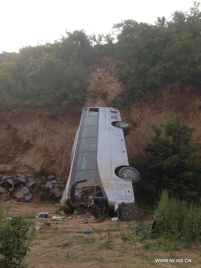 Photo taken on May 15, 2015 shows the accident site after a bus overturned and fell into a valley in Chunhua county of Xianyang City, northwest China's Shaanxi Province. At least thirty people were killed in the accident which happened at about 3:27 p.m. on Friday when a bus carrying 44 plunged 30 meters into a ravine. (Xinhua)