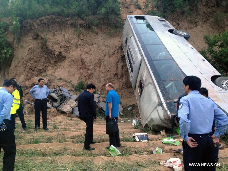 Photo taken on May 15, 2015 shows the accident site after a bus overturned and fell into a valley in Chunhua county of Xianyang City, northwest China's Shaanxi Province. At least 33 people were killed and 6 others injured in the accident which happened at about 3:27 p.m. on Friday when a bus carrying 44 passengers and two drivers plunged 30 meters into a ravine. (Xinhua)