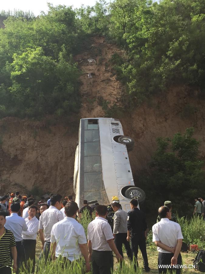 Photo taken on May 15, 2015 shows the accident site after a bus overturned and fell into a valley in Chunhua county of Xianyang City, northwest China's Shaanxi Province. At least 33 people were killed and 6 others injured in the accident which happened at about 3:27 p.m. on Friday when a bus carrying 44 passengers and two drivers plunged 30 meters into a ravine. (Xinhua/Kong Weizhe)