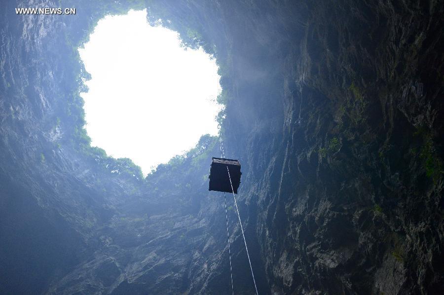 Workers carry rubbish out of a Tiankeng, a Karst landform, by a hanging basket at Luoquanyan Village of Xuan'en County, central China's Hubei Province, May 15, 2015. Dozens of workers started to clear the rubbish out of the over 290-meter-deep Tiankeng, which was used as a refuse dump, since January this year. A local enterprise invests several million yuan on the rubbish clearance with an aim to restore the ecological system in the Tiankeng and to develop it into an integrated scenic spot of expedition, leisure and geologic sightseeing. (Xinhua/Song Wen)