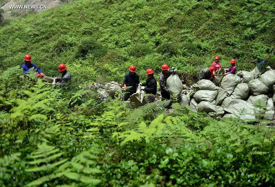 Workers clear the rubbish in a Tiankeng, a Karst landform, at Luoquanyan Village of Xuan'en County, central China's Hubei Province, May 15, 2015. Dozens of workers started to clear the rubbish out of the over 290-meter-deep Tiankeng, which was used as a refuse dump, since January this year. A local enterprise invests several million yuan on the rubbish clearance with an aim to restore the ecological system in the Tiankeng and to develop it into an integrated scenic spot of expedition, leisure and geologic sightseeing. (Xinhua/Song Wen) |