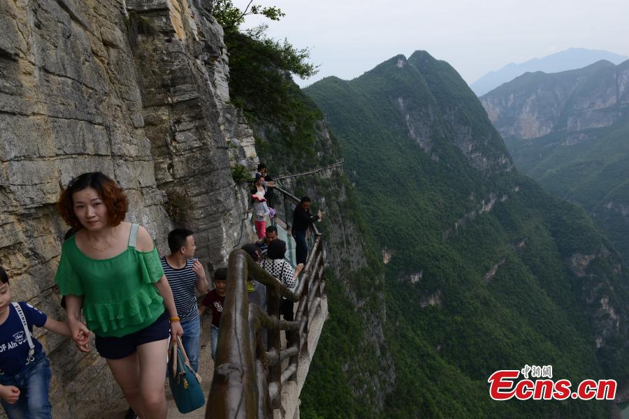 Tourists challenge themselves by following a walkway built on the edge of a cliff, about 1,000 meters above the ground, at a scenic spot in Yunyang county, Southwest China’s Chongqing municipality, May 16, 2015. The path, which is 3,200 meters long and one meter wide, includes a section made of glass that allows visitors to look straight down into the deep valley. (Photo: China News Service/Liu Xiaoyang) |