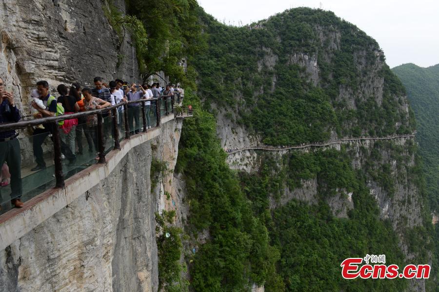 Tourists challenge themselves by following a walkway built on the edge of a cliff, about 1,000 meters above the ground, at a scenic spot in Yunyang county, Southwest China’s Chongqing municipality, May 16, 2015. The path, which is 3,200 meters long and one meter wide, includes a section made of glass that allows visitors to look straight down into the deep valley. (Photo: China News Service/Liu Xiaoyang) |