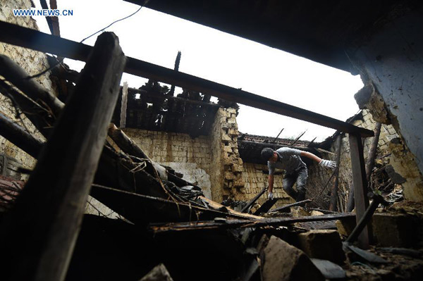 A villager clears the rubble of a house that is destroyed by heavy rain at Luojin Township of Yongfu County, south China's Guangxi Zhuang Autonomous Region, May 17, 2015. Downpours battered Guangxi on Saturday, damaging houses, disrupting traffic and killing at least four people. About 170,000 people in 20 counties were severely affected by the downpours and rain-triggered floods. Local governments have evacuated more than 5,700 people. The rain also toppled 155 houses, led to surging waters in 12 main rivers of Guangxi and blocked traffic in remote regions. (Xinhua/Lu Boan) |