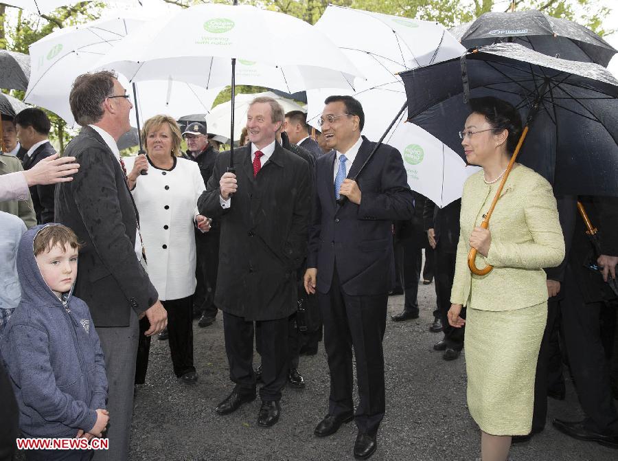 Chinese Premier Li Keqiang (2nd R) and his wife, Prof. Cheng Hong (1st R), in the company of Irish Prime Minister Enda Kenny (3rd R) and his wife Fionnuala O'Kelly, visit Garvey's Farmhouse, a typical Irish family-run cow farm in Shannon, Ireland, May 17, 2015.(Xinhua/Huang Jingwen) |