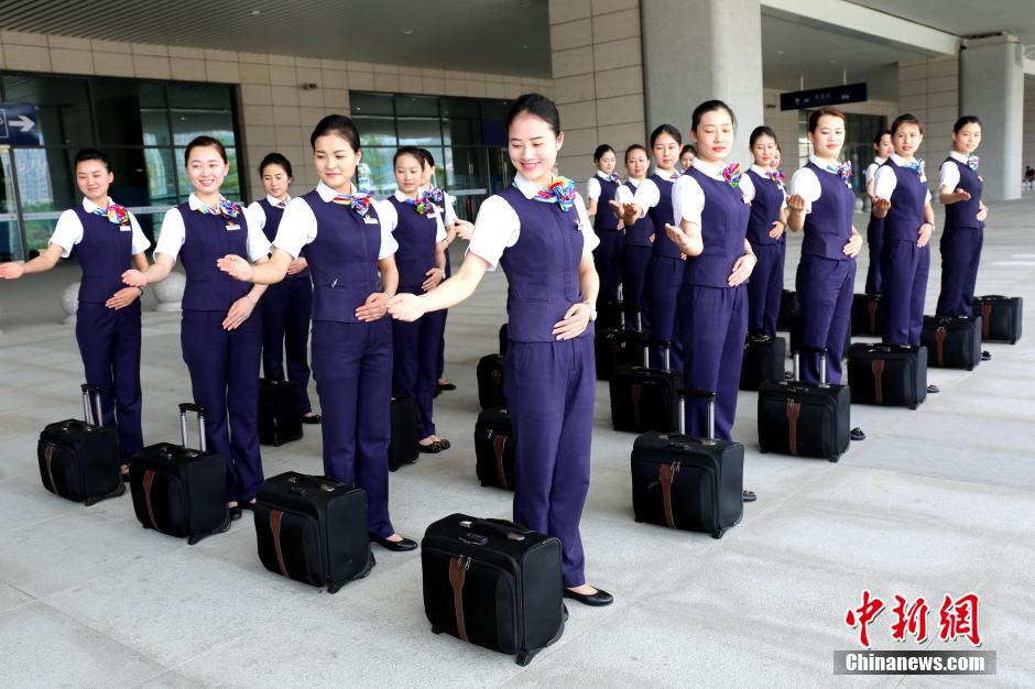 To celebrate the upcoming formal operation of Hefei-Fuzhou high speed rail (running 806 kilometers from Hefei of Anhui province to Fuzhou of Fujian province), 24 beautiful stewardesses who will serve on the trains debut in the north square of Fuzhou Railway Station, attracting much attention from passengers. (Chinanews/Li Yiming)