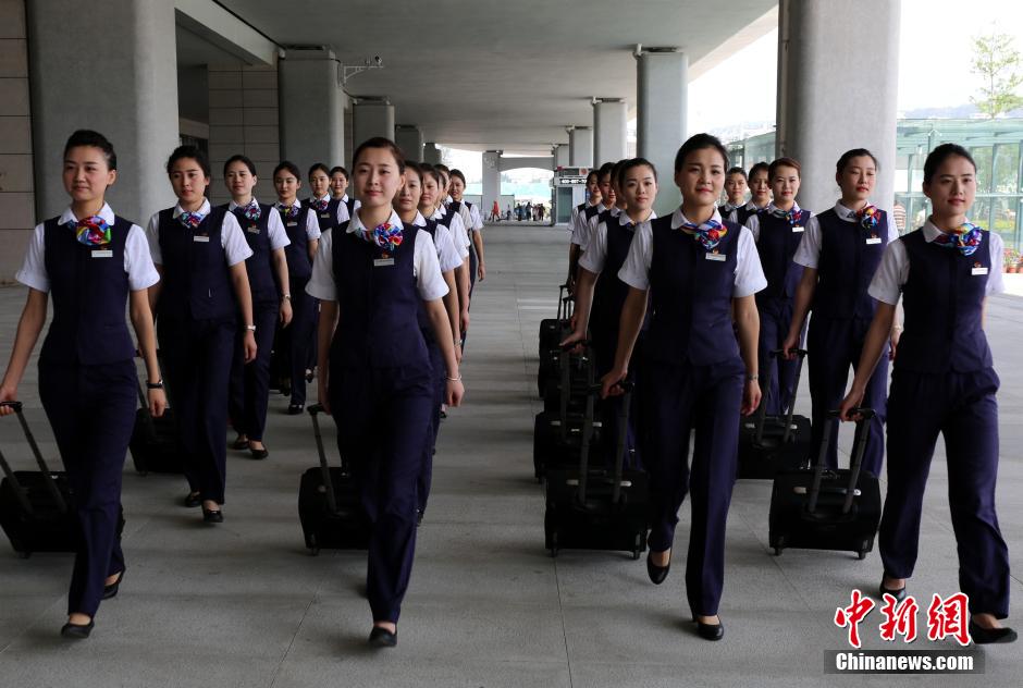 To celebrate the upcoming formal operation of Hefei-Fuzhou high speed rail (running 806 kilometers from Hefei of Anhui province to Fuzhou of Fujian province), 24 beautiful stewardesses who will serve on the trains debut in the north square of Fuzhou Railway Station, attracting much attention from passengers. (Chinanews/Li Yiming)