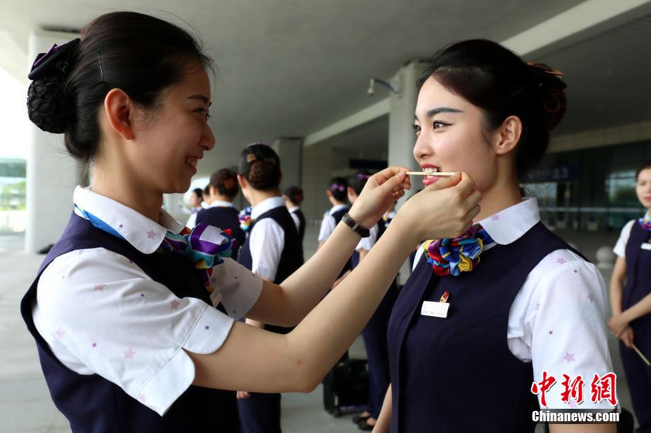 To celebrate the upcoming formal operation of Hefei-Fuzhou high speed rail (running 806 kilometers from Hefei of Anhui province to Fuzhou of Fujian province), 24 beautiful stewardesses who will serve on the trains debut in the north square of Fuzhou Railway Station, attracting much attention from passengers. (Chinanews/Li Yiming)
