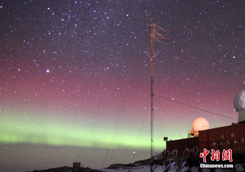Southern lights appear in the sky over the Antarctic Zhongshan Station on the early morning of May 14, 2015. Southern lights are caused by charged particles interacting with the upper atmosphere in the high magnetic latitude.