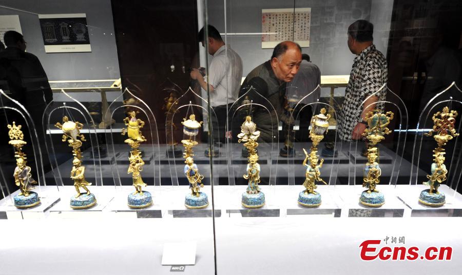 Visitors view cultural relics at an exhibition to mark International Museum Day in Jinan city, capital of East China’s Shandong province, May 18, 2015. Some 319 centerpieces from the province’s 25 museums, including pottery, porcelain, jade works, calligraphy, sculpture, and seal stamps used by author Pu Songling (1640-1715), were on display in the exhibition. (Photo: China News Service/Zhang Yong) |