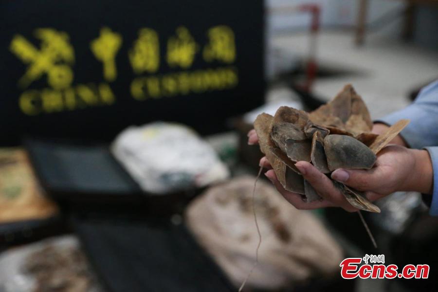 An officer with China Customs shows off pangolin scales smuggled from Africa in Shanghai municipality, May 18, 2015. China Customs seized 249 kg of pangolin scales stored in nine separate pieces of luggage, the largest smuggling case of animal and plant products in Shanghai. A suspect worked with a colleague in Africa to smuggle the items and then sell in China. According to traditional Chinese medicine beliefs, the scales of a pangolin may help reduce swelling and boost lactation. (Photo: China News Service/Huang Shangshang) |