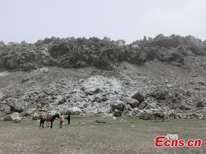A huge section of the body of the Kongur Tiube glacier collapses in Akto county in the Kizilsu Kirghiz autonomous prefecture, Northwest China’s Xinjiang Uygur autonomous region. Li Zhongqin, the head of CAS Tianshan Mountains Glacier Observation Station, says climate change is at the center of explanations of glacier movement. (Photo provided to China News Service) |