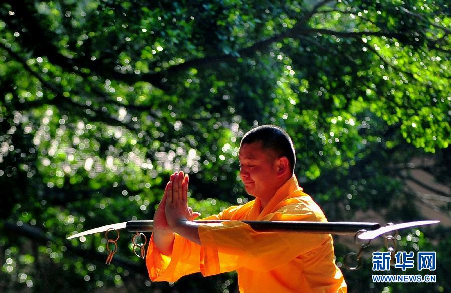 A monk displays martial skill of the Southern Shaolin, May 15, 2015. (Xinhua/Wei Peiquan)