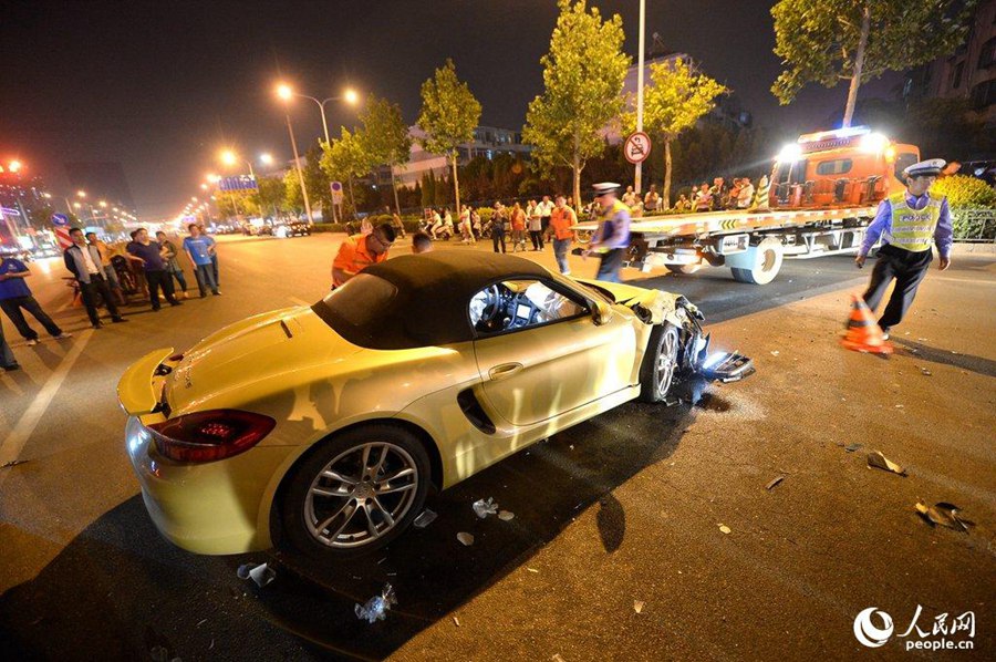 A Porsche crashes into a sanitation garbage truck in Jinan, east China's Shandong province on the evening of May 18. (CFP/Wen Lu)