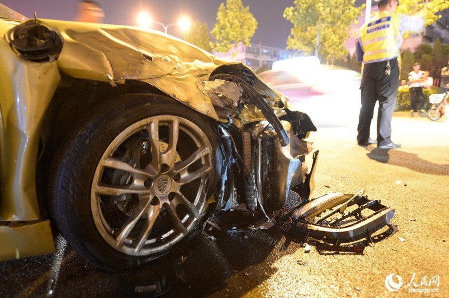 A Porsche crashes into a sanitation garbage truck in Jinan, east China's Shandong province on the evening of May 18. (CFP/Wen Lu)