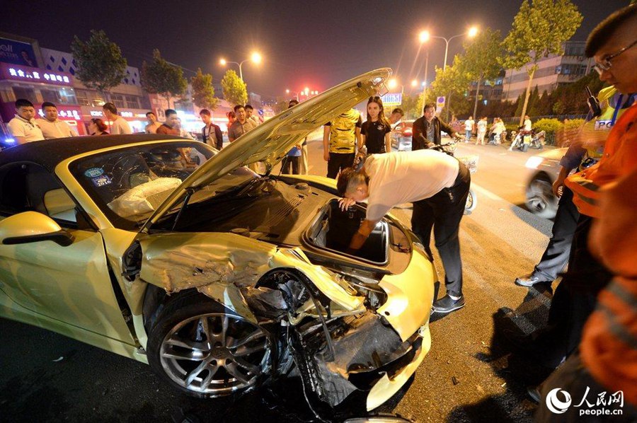 A Porsche crashed into a garbage truck 200 meters away from a cross road in Jinan, east China’s Shandong province at around 9:30 p.m. on May 18, 2015. Local residents said that a pregnant woman in the Porsche was injured and sent to hospital