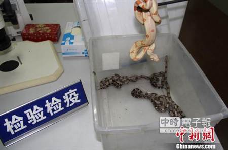 The snakes, boa constrictors, are from central and south America. They are non-venomous, pet snakes, said Li Qiang, director of the bureau.