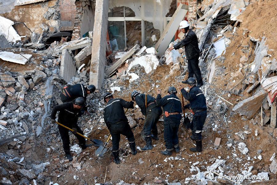 Rescuers search for the missing in the rubble at Yimin New Village of Tuban Town in Linxian County, north China's Shanxi Province, May 20, 2015. Four people were dead and four others missing in a landslide of a loess hill burst burying four farmers' houses Tuesday evening. (Xinhua/Zhan Yan) |