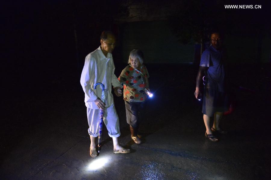 Elderly residents walk on a flooded street in Hengjiang Town of Shicheng County, east China's Jiangxi Province, May 19, 2015. Seven people have been killed in landslides and house collapses caused by torrential rain in Jiangxi since Monday. The downpour has flooded 13,810 hectares of farmland, and destroyed hundreds of homes, forcing almost 10,000 to leave their homes. (Xinhua/Zhou Mi) |