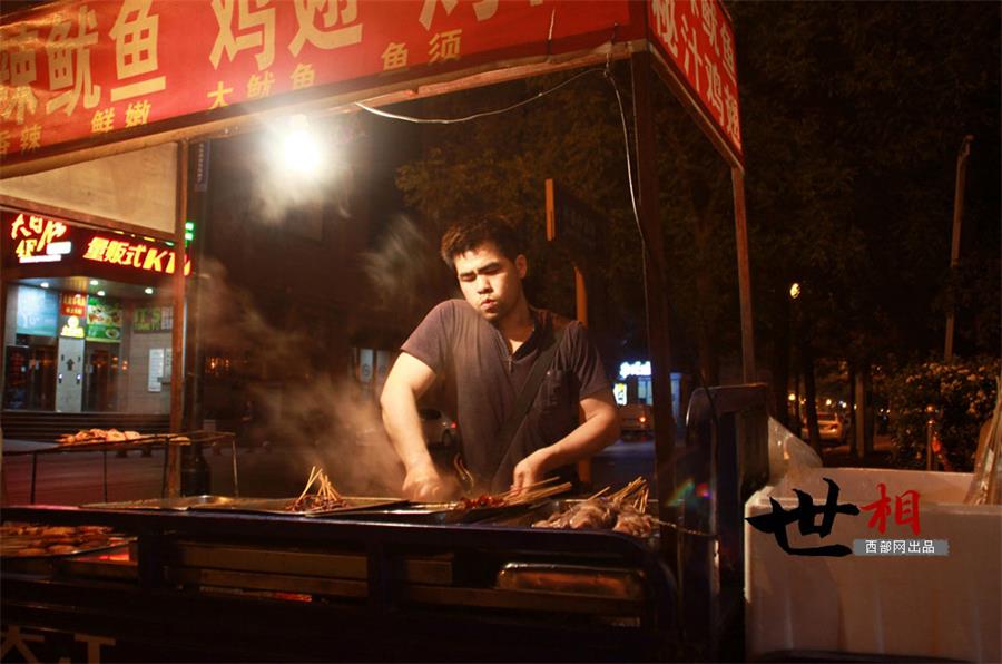 Ren Yongan, 32, has been selling teppanyaki-style squid and grilled chicken wings in the past four years. He works from 9:30 p.m. to 1.a.m. On average, he can sell more than 200 skewers of squid and chicken wings a night.
