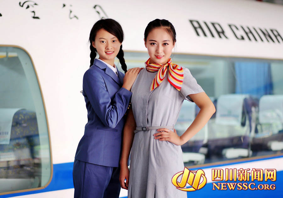 Students present the air stewardess uniforms of the past in Chengdu East Star Airlines Travel College, southwest China's Sichuan province, May 12, 2015. You can see the fashion changes through the years when you look at these uniforms. (Photo/newssc.org) |