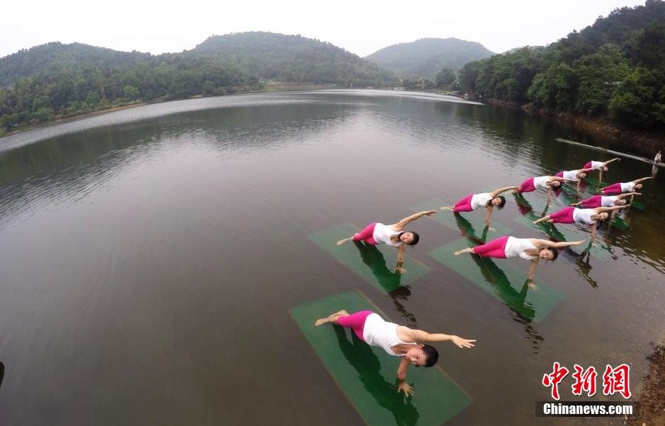 Several beauties perform Yoga on water in Shiyan Lake in Changsha, central China's Hunan province on May 20, 2015. (CNS/Yang Huafeng)