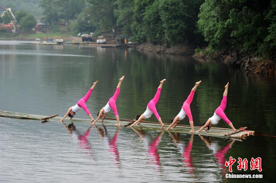 Several beauties perform Yoga on water in Shiyan Lake in Changsha, central China's Hunan province on May 20, 2015. (CNS/Yang Huafeng)