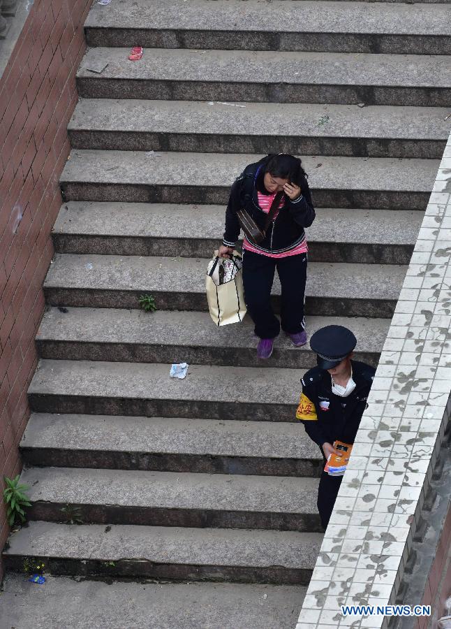 A policeman escorts a resident back home near a building collapse site in Guiyang, capital of southwest China's Guizhou Province, May 21, 2015. Five bodies were found in the rubble of a collapsed building in central Guiyang Thursday. The accident happened on Wednesday, when the nine-story building with 114 residents living in it fell down. (Xinhua/Liu Xu) |