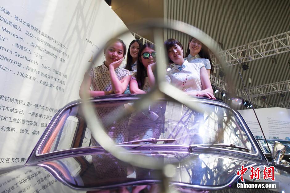 Upon graduation, a group of university students dressed in cheongsams pose for photos at an auto show in Taiyuan, north China's Shanxi Province.(Chinanews.com/Zhang Yun)
