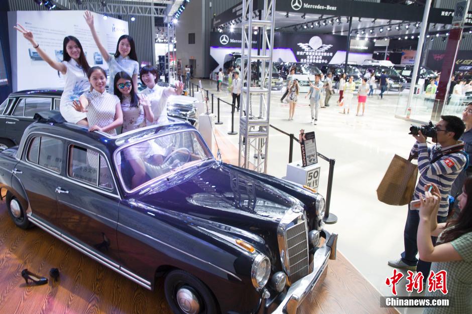 Upon graduation, a group of university students dressed in cheongsams pose for photos at an auto show in Taiyuan, north China's Shanxi Province.(Chinanews.com/Zhang Yun)