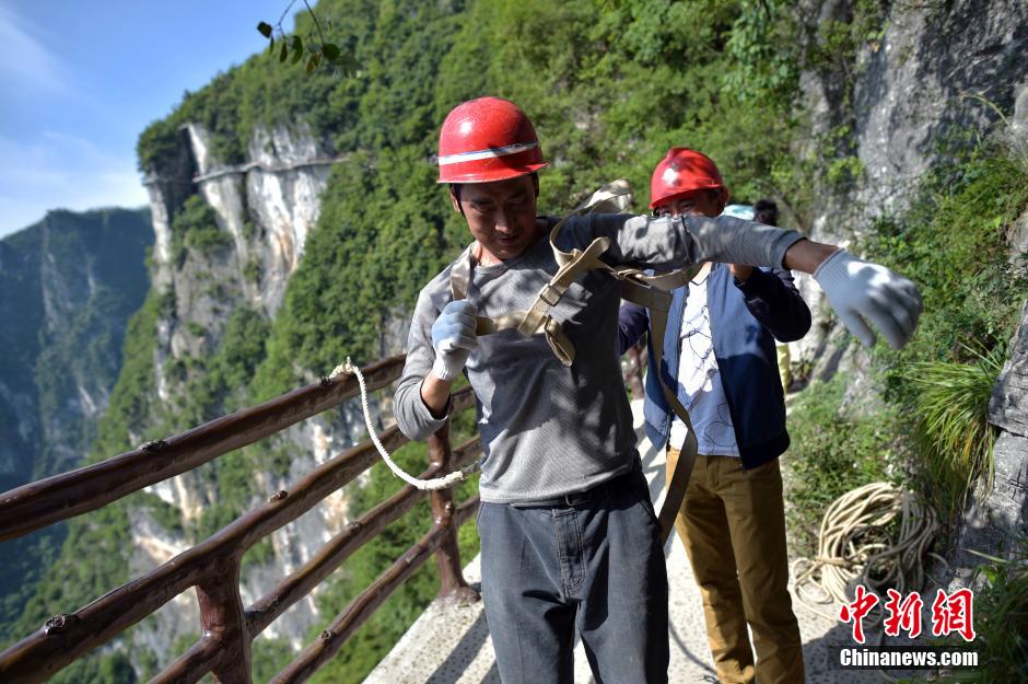 Photo shows a litter picker putting on the safety belt.(Photo/Chinanews.com)