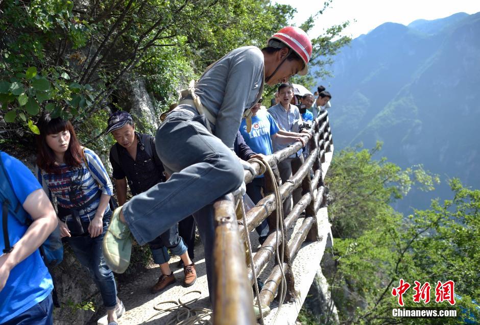 Photo shows a litter man climbing over the guard rail.(Photo/Chinanews.com)
