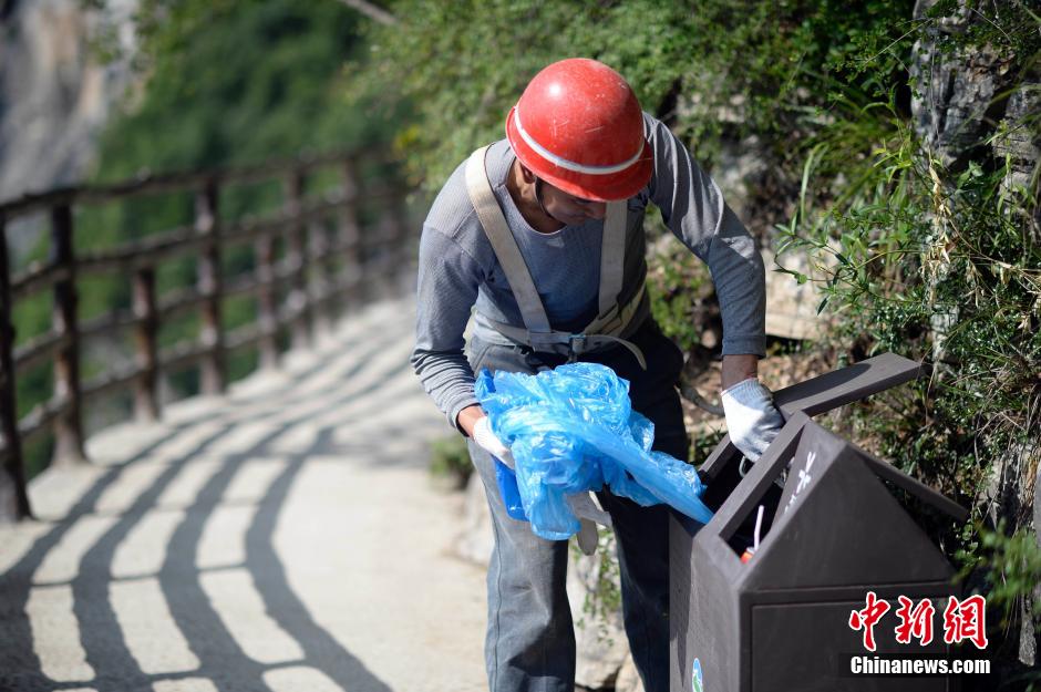 A litter picker pours the litter into a rubbish bin on the skywalk.(Photo/Chinanews.com)