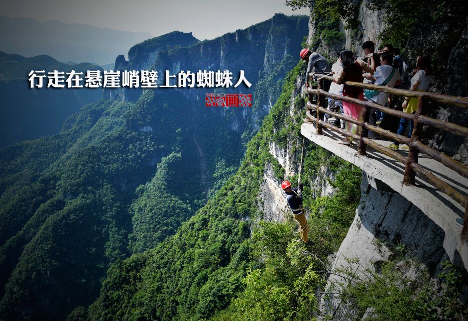 A group of "spider men" litter pickers risk their lives to abseil down cliffs and clean away the bottles and plastic bags thrown over the cliff edge by tourists. Their life tied to a rope onto the cliff.(Photo/Chinanews.com)