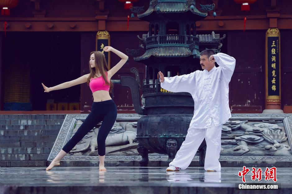Fu Jiamei, the campus belle of Beijing Sport University, does tai chi and performs Yoga in the Longhu Mountain. (CNS/Yu Kai)