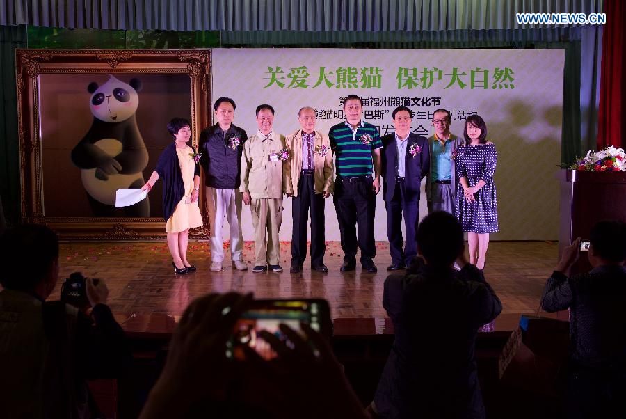 Guests pose for a photo at an activity celebrating the 35th birthday for giant panda Basi at a giant panda research center in Fuzhou, capital of southeast China's Fujian Province, May 21, 2015. Basi, the equivalent of over 100 years in human age, is the oldest living giant panda in Chinese mainland. (Xinhua/Jiang Kehong) |
