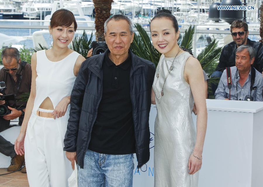Director of the film "Nie Yinniang" (the Assassin) Hou Hsiao-Hsien (C) and cast members Hsieh Hsin-Ying (L) and Sheu Fang-Yi pose for photos at the photocall during the 68th Cannes Film Festival in Cannes, France, on May 21, 2015. The film "Nie Yinniang" (the Assassin) would premiere at the 68th Cannes Film Festival on Thursday. (Xinhua/Zhou Lei)