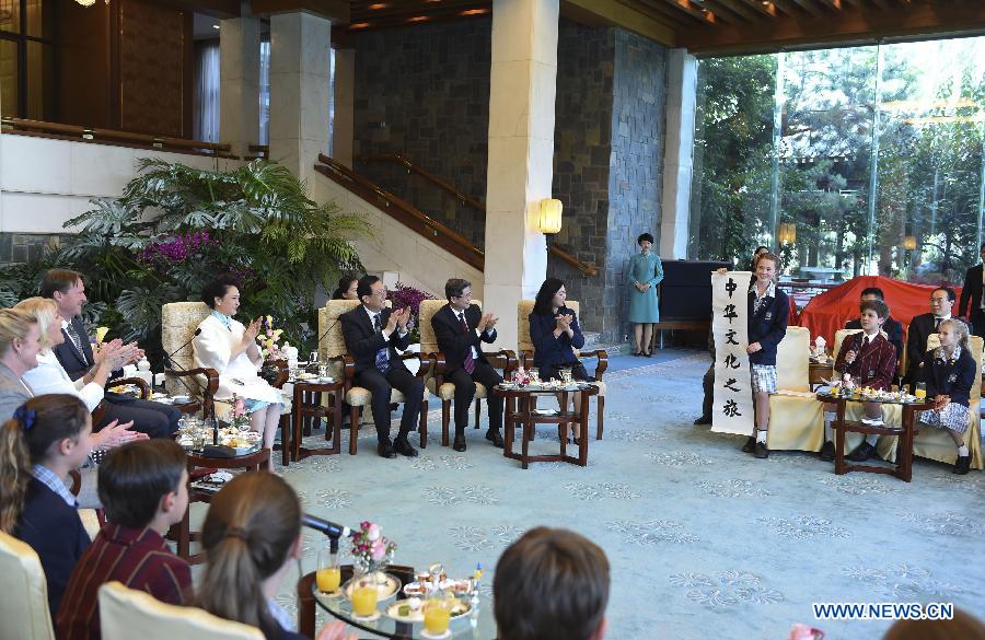 Peng Liyuan, Chinese President Xi Jinping's wife, meets with Australian youngsters from Tasmania at the Diaoyutai State Guesthouse in Beijing, China, May 21, 2015. (Xinhua/Xie Huanchi)
