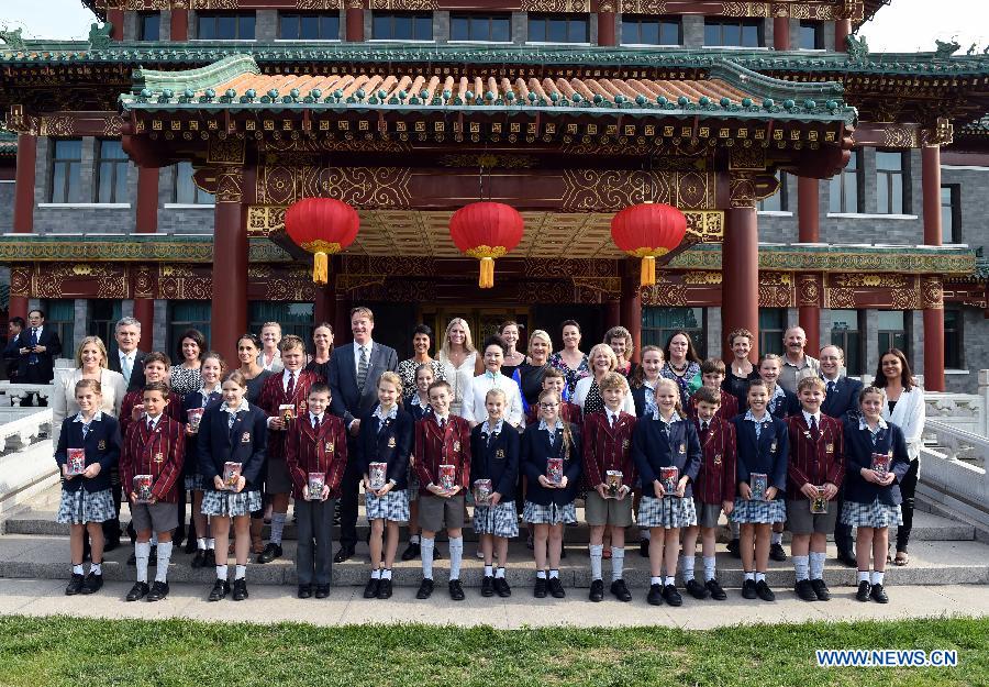 Peng Liyuan, Chinese President Xi Jinping's wife, poses with Australian youngsters from Tasmania for a group photo at the Diaoyutai State Guesthouse in Beijing, China, May 21, 2015. (Xinhua/Rao Aimin)
