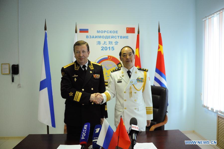 Du Jingchen(R), deputy commander of the Navy of the People's Liberation Army of China shakes hands with Alexander Fedotenkov, deputy commander of the Russian Navy during a joint press conference in Novorossiysk, Russia, on May 21, 2015. Chinese and Russian naval forces on Thursday ended their joint military exercises in the Mediterranean, according to an online news briefing from the Chinese Defense Ministry. (Xinhua/Dai Tianfang) |
