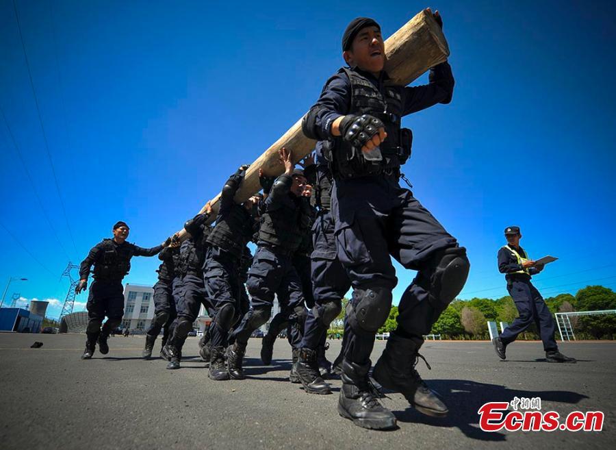 Members of the special police task force “Flying Tiger" train at a base in Urumqi city, capital of Northwest China’s Xinjiang Uygur autonomous region, May 21, 2015. The task force, which was established on May 22, 2010, has played an important role in counter-terrorism efforts and maintaining social stability, sources say. (Photo: China News Service/Liu Xin)