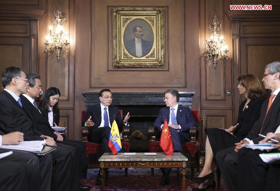 Chinese Premier Li Keqiang (L Back) holds talks with Colombian President Juan Manuel Santos (R Back) in Bogota, capital of Colombia, May 21, 2015. (Xinhua/Ding Lin)