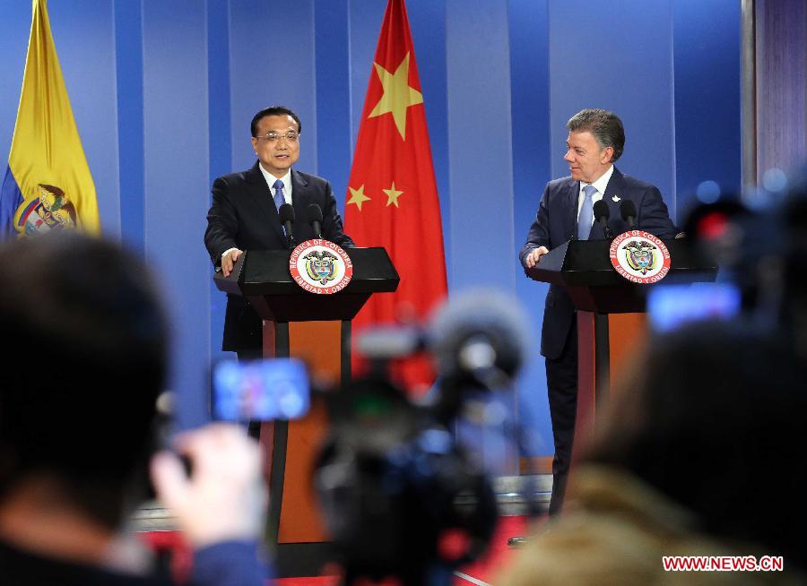 Chinese Premier Li Keqiang (L) speaks while Colombian President Juan Manuel Santos looks on during a press conference held after their talks in Bogota, capital of Colombia, May 21, 2015. (Xinhua/Liu Weibing)