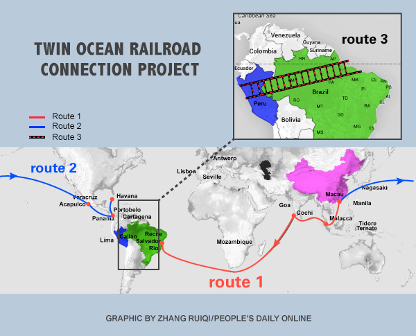 During Premier Li’s visit to Brazil, Colombia, Peru and Chile, a series of agreements will be signed. Among those agreements signed is a memorandum of understanding between Peru, China and Brazil to build a cross-continental railroad linking Peru's Pacific coast with Brazil's Atlantic coast. The project is called the Twin Ocean Railroad Connection.